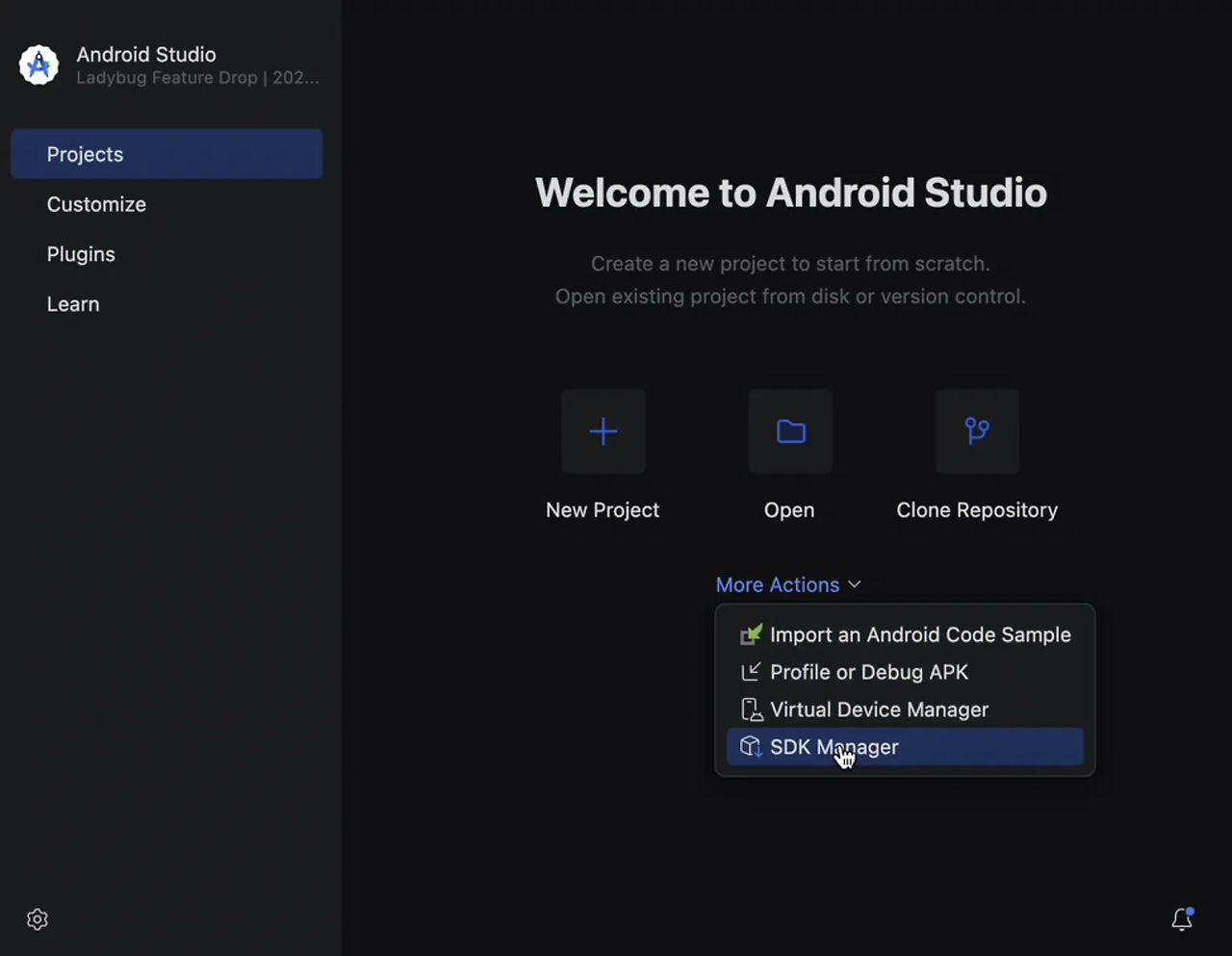 Android Studio 설치가 완료되면 아래와 같은 화면이 나타납니다. More Actions 버튼을 누르고 SDK Manager 를 선택해주세요.