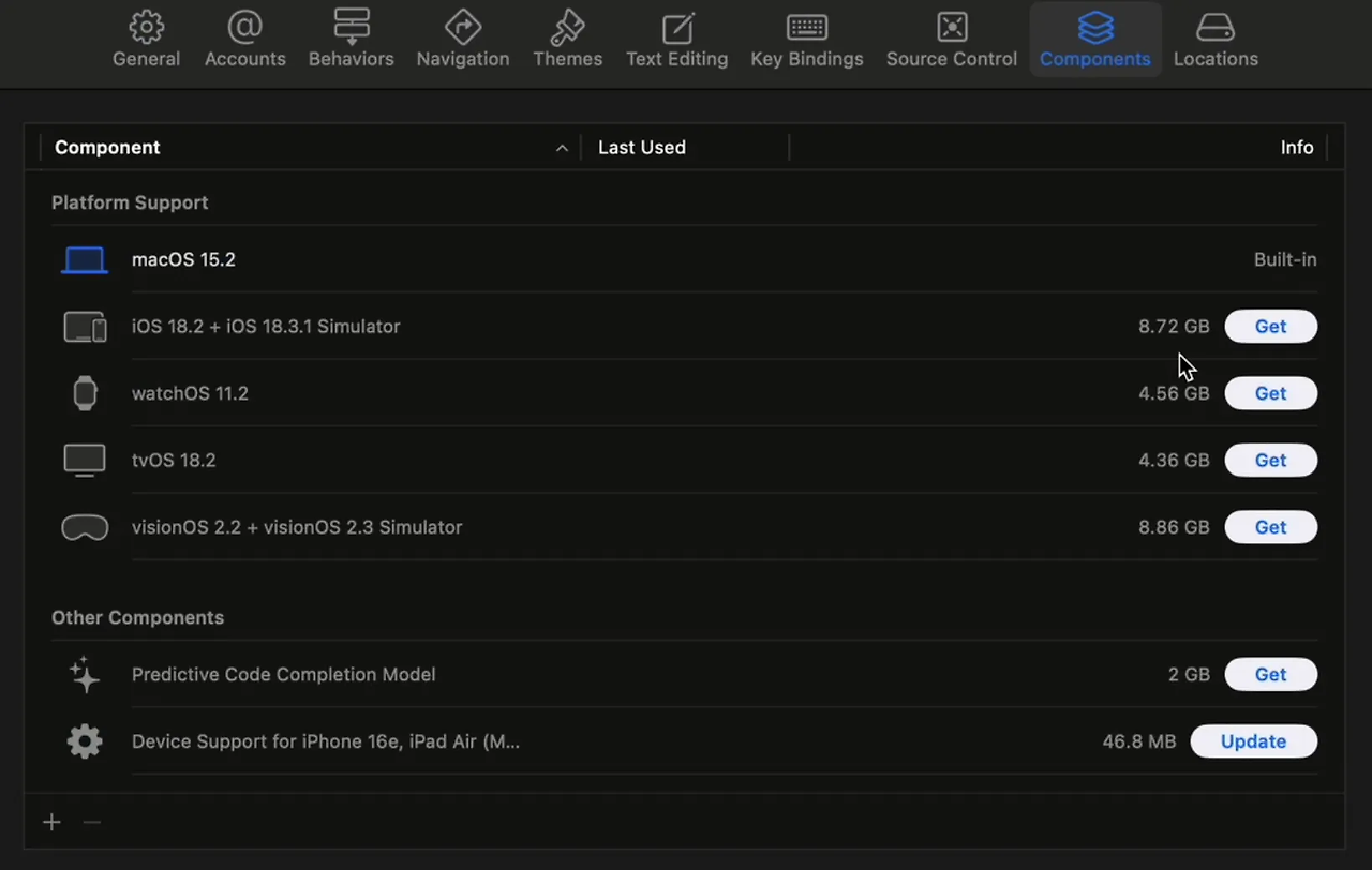 만약 iOS를 선택하지 않고 설치했다면, 추후 Xcode - [Settings] - [Components] 탭에서 추가할 수 있습니다. (아래 이미지 참고)