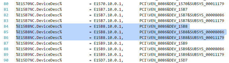 \PRO1000\Winx64\NDIS65 폴더에 있는 e1d65x64.inf 파일수정