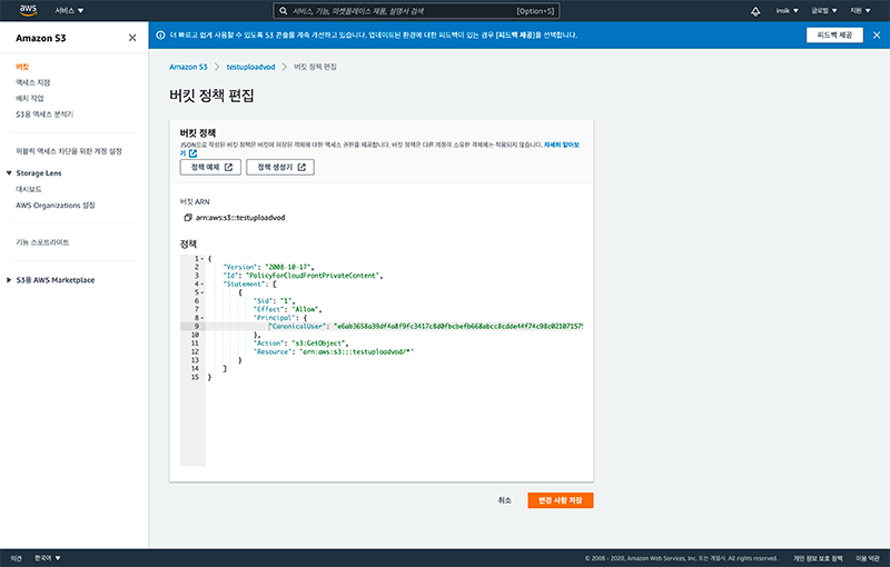 '변경 사항 저장'을 누르면 "CanonicalUser" 의 키와 값이 저장되고 나면 "AWS": "arn:aws:iam::cloudfront:user/CloudFront Origin Access Identity E16TH420ZUON0B" 이런 식으로 변경되어 반영되어 진다.