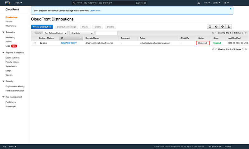체크 박스를 선택하고 'Distribution Settings' 를 누르거나 바로 Distribusion의 ID를 클릭해서 해당 Distribution 상세 페이지로 이동한다.